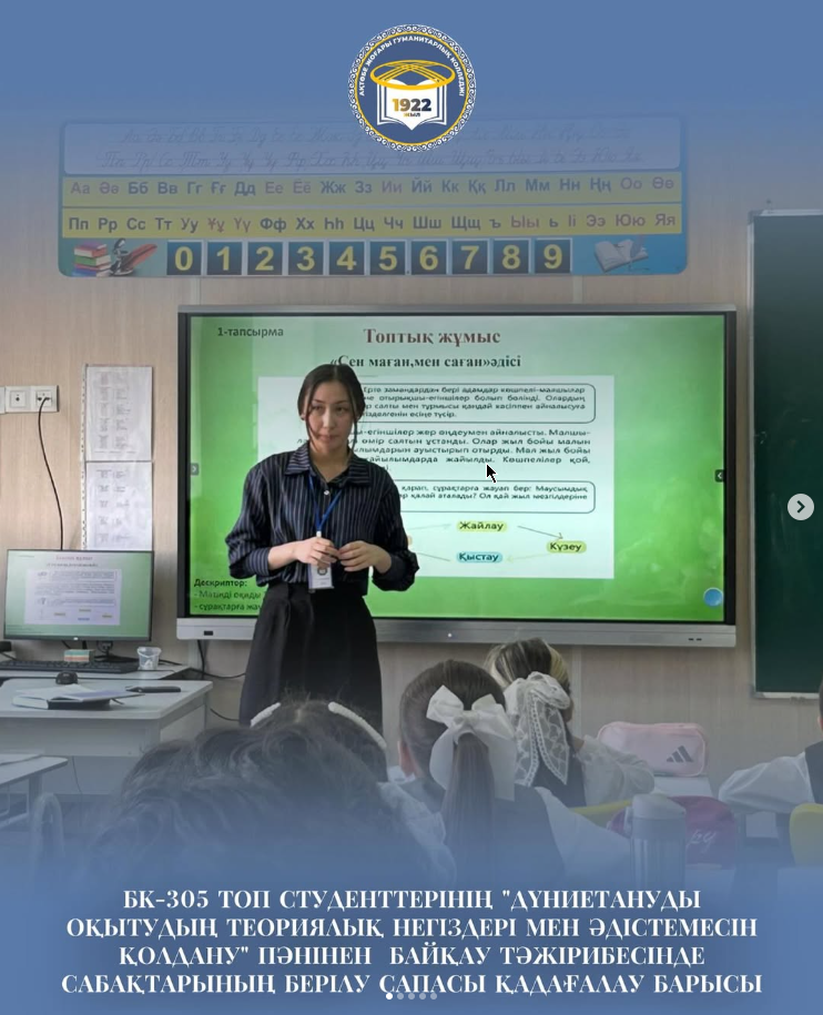 «Дүниетануды оқытудың теориялық негіздері мен әдістемесін қолдану» пәнінен байқау тәжірибесінде сабақтарының берілу сапасы қадағаланды.