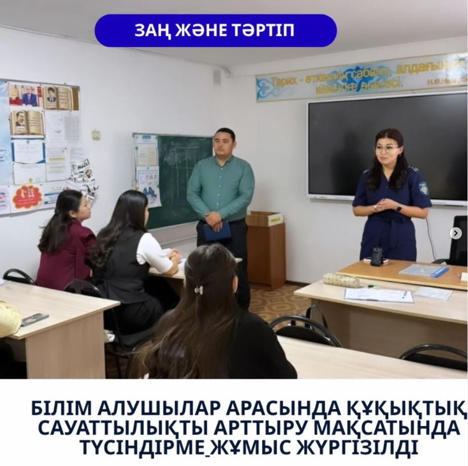 Участковый инспектор полиции по делам несовершеннолетних ОВД района Астаны №1 города Актобе Бакитжанова Фариза Ержановна встречается со студентами
